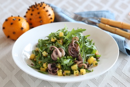 Салат из мини-осьминогов с сальсой из манго с лаймовым соусом