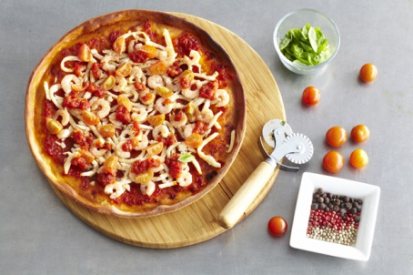 - Поставить в разогретую до 200°С духовку на 20 мин. Выложить на пиццу креветки и кальмары и вернуть в духовку еще на 6-7 мин.