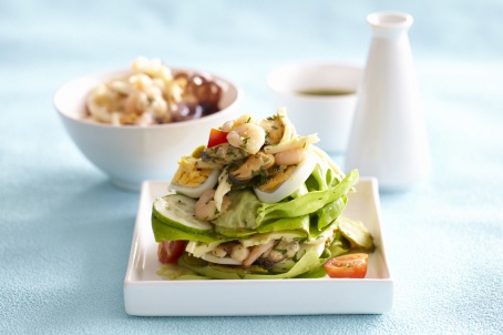 - На блюдо положить половину зеленого салата, половину яиц, огурцов и помидоров. Сверху выложить половину подготовленных морепродуктов. Повторить слои, накрыть и вернуть салат в холодильник на 15-20 мин.