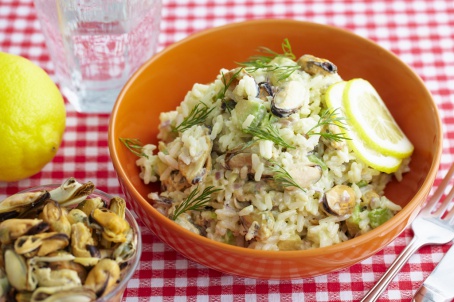 - Разогреть в сковороде оставшееся масло и обжарить в нем лук, 4 мин. Добавить в рис лук, авокадо и мидии. Приправить майонезом, солью и перцем по вкусу.