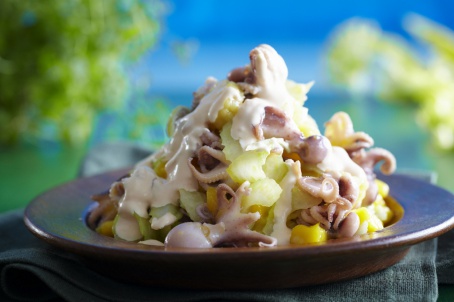 - Смешать в миске черешки сельдерея, манго, кукурузу и осьминогов.