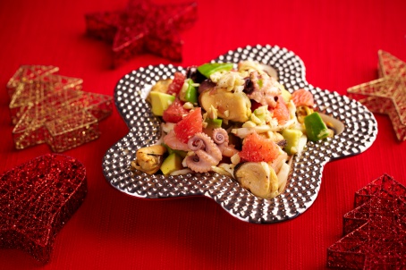 - Морепродукты смешать с авокадо и мякотью грейпфрутов, заправить. Поставить в холодильник минимум на 1 час.