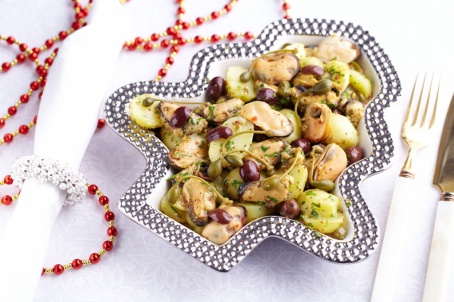 - Оливки освободить от косточек и крупно нарубить. Мидии в масле с вялеными томатами, чесноком и зеленью смешать с каперсами, оливками и нарубленными листьями петрушки. Добавить остывший картофель, полить оставшейся заправкой и аккуратно перемешать. Посыпать черным перцем крупного помола.