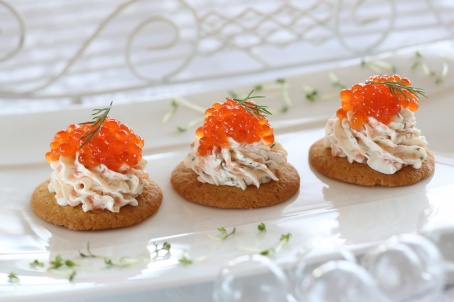 - На печенья разложите мусс из сёмги. Украсьте его красной икрой и укропом. Сразу подавайте.