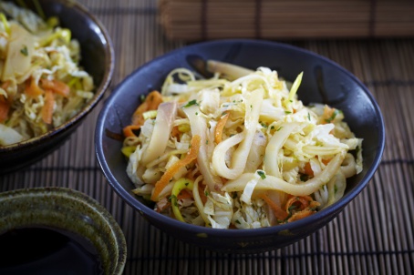 - В миске перемешать капусту, морковь, кольца лука и зелень. Влить сок лайма и соевый соус, перемешать.