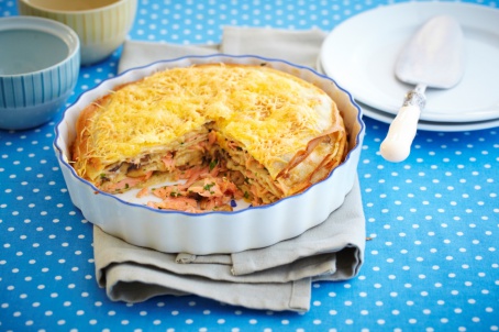 Блинчатый пирог с начинкой из рыбы и шампиньонов