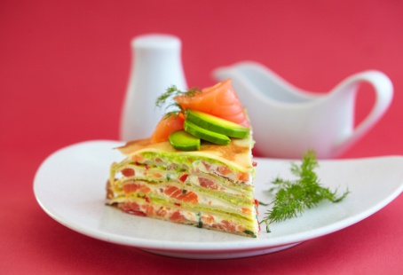 Блинчатый пирог с форелью и авокадо