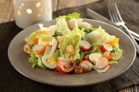 - Яйца и помидоры разрежьте на 4 части. В большой салатнице перемешайте салат, гренки, помидоры и крабовые палочки вместе с маринадом. Добавьте заправку, перемешайте. Украсьте салат яйцами и подавайте.