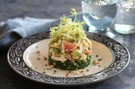 - Зелёный лук мелко нарежьте и обжарьте на сливочном масле, 3-5 мин. При помощи сервировочного кольца выложите на тарелку сначала слой зеленого лука, потом крабового мяса и авокадо. Снимите кольцо, украсьте закуску салатом фризе и сбрызните кедровым соусом. Сразу подавайте.
