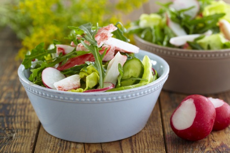 - Крабовые палочки нарезать кусочками. Салатные листья и руколу вымыть, обсушить. Листики руколы оставить, как есть. Листья латука крупно нарвать руками. Огурчики и редис вымыть и нарезать кружками. Поместить всю зелень, огурцы и редис в салатницу. Слегка посолить.