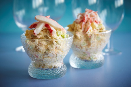 - Салат выложить горкой на блюдо. Оставшиеся палочки нарезать продольными полосками шириной примерно 0,7 см. Уложить их вертикально на горку.