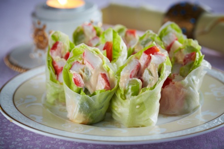 Приготовление таких рулетов – увлекательное занятие для взрослых и детей. Подготовьте все ингредиенты, добавив брусочки огурца, моркови и сыра, разложите на блюде, соус поставьте в центр блюда. Пусть каждый участник создаст рулет на свой вкус!