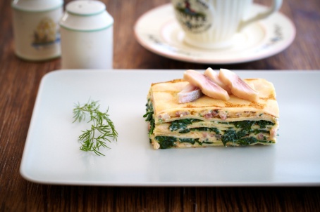 - На большую плоскую тарелку положить блин, распределить начинку из сельди, на него положить следующий блин и распределить начинку из шпината. Повторять, пока не закончатся обе начинки. Перед подачей пирог охладить и нарезать на клинья.