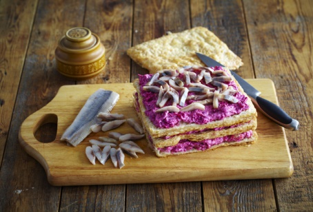 - Разделить тесто на 4 коржа. Три коржа смазать подготовленной начинкой из свеклы. Сверху распределить кусочки сельди. Сложить коржи друг на друга. Накрыть четвертым коржом. Слегка прижать руками. Положить пирог на блюдо, накрыть пищевой пленкой и поставить в холодильник минимум на 3 часа.