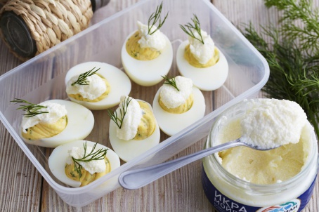 - Выложить приготовленную смесь в яичные белки, сверху распределить икру мойвы. Сложить яйца в контейнер, накрыть пищевой пленкой и крышкой.