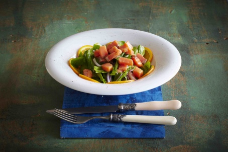 - Разложить на блюде апельсин, сверху выложить готовый салат.
