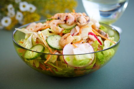 - Добавить морепродукты с заправкой к салату, перемешать и подать к столу.