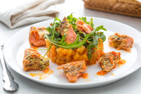 Салат с кижучем «лимонный перец», рукколой и тартаром из хурмы