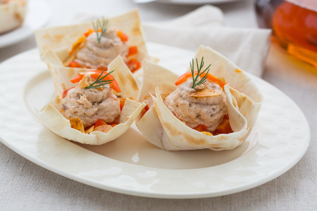 Тарталетка с лососевым риетом с миндалем и сладким перцем