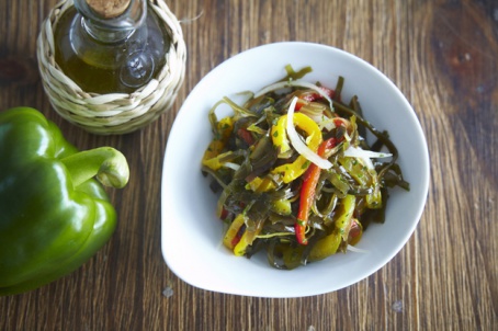- Остывшие перцы очистить от кожицы и семян. Мякоть нарезать тонкими полосками. Лук очистить и нарезать полукольцами. Петрушку вымыть, обсушить и измельчить. С лимона снять цедру и нарезать ее тонкой соломкой. Добавить в морскую капусту перцы, лук, петрушку и цедру. Приправить солью и перцем, перемешать.