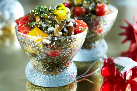 - Полить салат заправкой, перемешать, оставить настояться на 30-40 минут. Переложить на блюдо, посыпать нарубленными листьями петрушки и кунжутом.